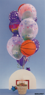 Two regular mylar messages, 7 latex balloons, and basket of candy.