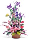 Roses, Button Poms, Iris, and Lilies in a rainbow of colors gathered in a clear glass vase. What more can we say?