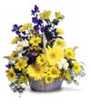 Send in the sun with this cheery bouquet. Blue Delphiniums accent the sunny yellow Gerbera Daisies, Daisy Poms, Alstroemeria, Mini-Carnations and more in a whitewashed basket.