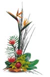 Vibrant reds, oranges and yellows. We've captured the colors of a tropical sunset with Birds of Paradise, Pincushion Protea, Solidago and more in a modern container. Spectacular. |