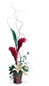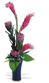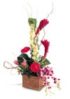 Rustic yet exotic, this dramatic arrangement features Orchids, Ginger and Anthurium intermingled with Ti leaves and Curly Willow in a rustic wood container.
